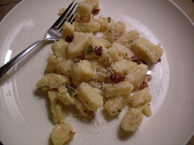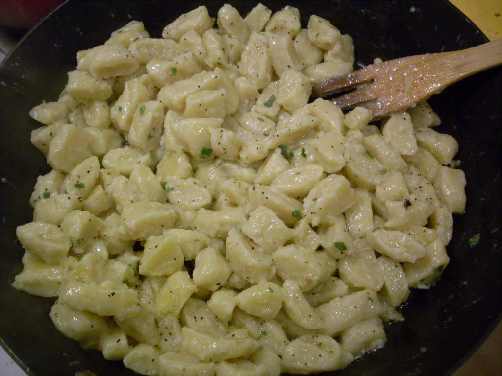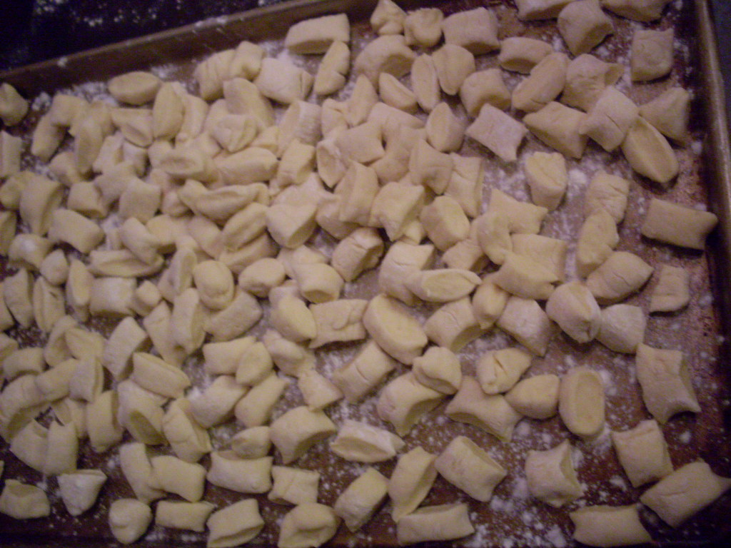 Sprinkle reserved flour on a large surface. Cut dough in half, and form each half into baseball-sized pieces. Roll each piece until it’s about one half-inch in diameter. Slice half-inch chunks, dropping slices onto a cookie sheet until you’re ready to drop the lot into a pot of boiling water. As mentioned, I only used half of this, and froze the rest. But that’s because I only ever have to feed four people.
