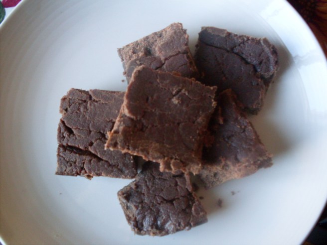 I adapted this recipe from an old Gourmet I found in one of the last boxes still left unpacked. It’s really very good. My version, I mean. It’s a soft, sticky, caramelly chocolate thing that feels dry on the outside but that’s soft inside and sticks to your teeth and reminds you that you need to floss and also maybe go for a run. I call it toffee chocolate fudge because the brown sugar makes it taste like toffee, but you can call it something else if you prefer. Use salted butter, but don’t add any salt. Use the best cocoa you have. And make it on a clear, cool day. Something about humidity causing unfortunate sugar crystals is why you don’t want to make fudge when there are low-hanging clouds. Science. Fudge.