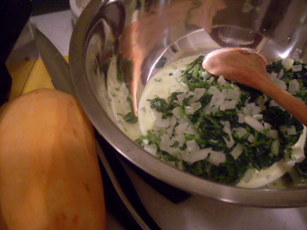 Melt three tablespoons of the butter in a heavy frying pan over medium-low heat. Add onions and garlic, and saute until softened and glistening, about three minutes. Remove from heat and add to spinach, along with salt, pepper, nutmeg, and cream. Stir to combine, and adjust seasonings as you like.