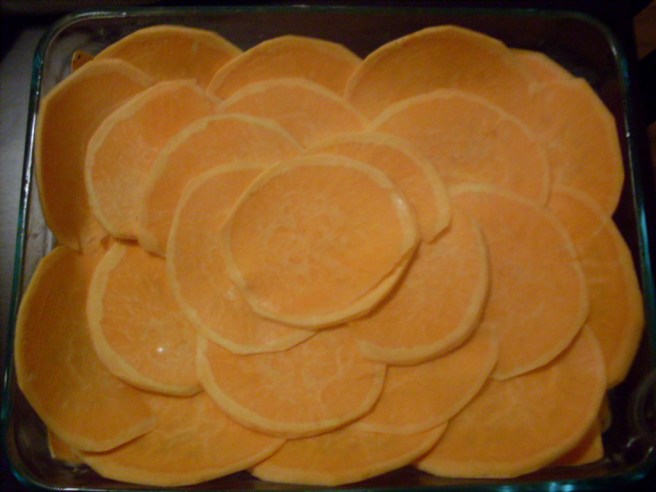 Preheat oven to 400°F. Line the bottom of a buttered 9″x13″ baking pan with thin slices of sweet potato. Do the math here – you’re going to need five layers of sweet potato, so divide your layers accordingly. About a fifth will do – if you can eyeball it, you’re better than me. My layers got thinner as they went.