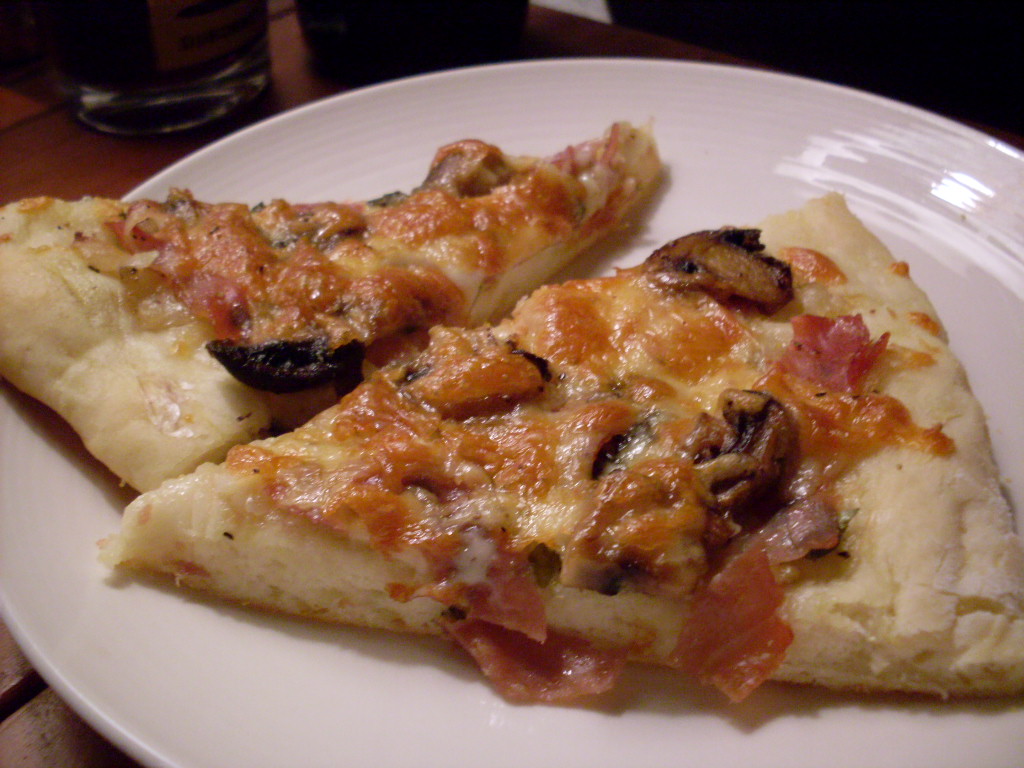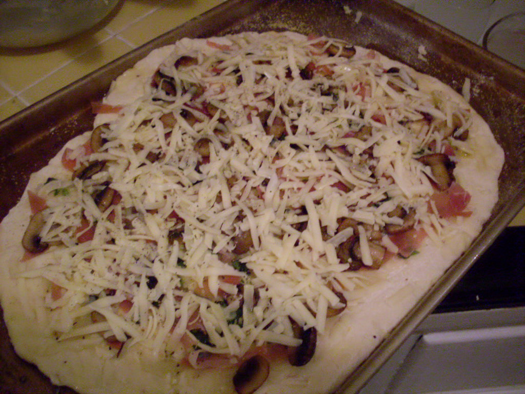 I topped the pizza with a sauce of a crushed bulb of roasted garlic and olive oil and some basil, strips of prosciutto, and a half-pound of mushrooms cooked in olive oil and garlic. And cheese, but not that much, actually, because even though it seems counter-intuitive not to load the thing up with an excess of cheese, on a pizza like this it’s better to use only what you need.