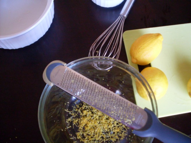Combine three-quarters of the sugar, flour, and lemon zest in a mixing bowl, and whisk well. Add the melted butter, lemon juice, and egg yolks, and whisk to form a batter. Slowly add in buttermilk (or whatehaveyou), whisking as you go.