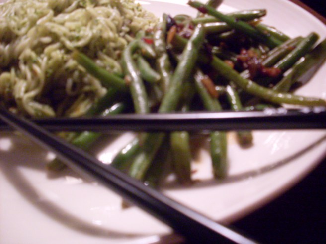 Green beans are my partner’s favorite veg, so he’ll appreciate this one. And I am eager to hear about the pretty pale green noodles.