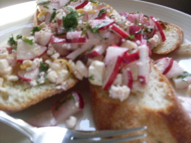 Because it is now spring, and a new season of veggies is upon us, today’s something homemade was radish bruschetta, loosely assembled and flung onto a few crusty slices of rustic baguette. I ate the overflow with a fork, and sipped sweet German Riesling all the while.