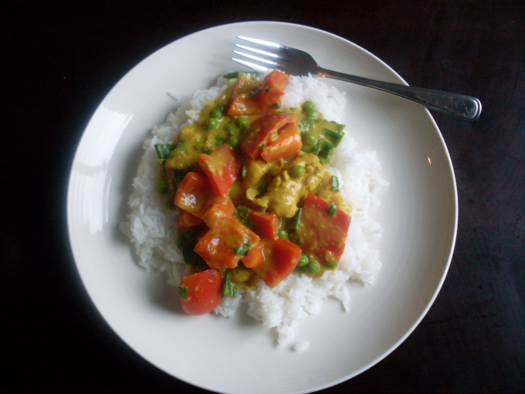 Stir in the green part of the green onions (chopped) and the frozen peas. Simmer for five minutes, stirring occasionally. Before serving taste to check your seasoning, adjust as needed, then add cilantro. Serve over jasmine rice.