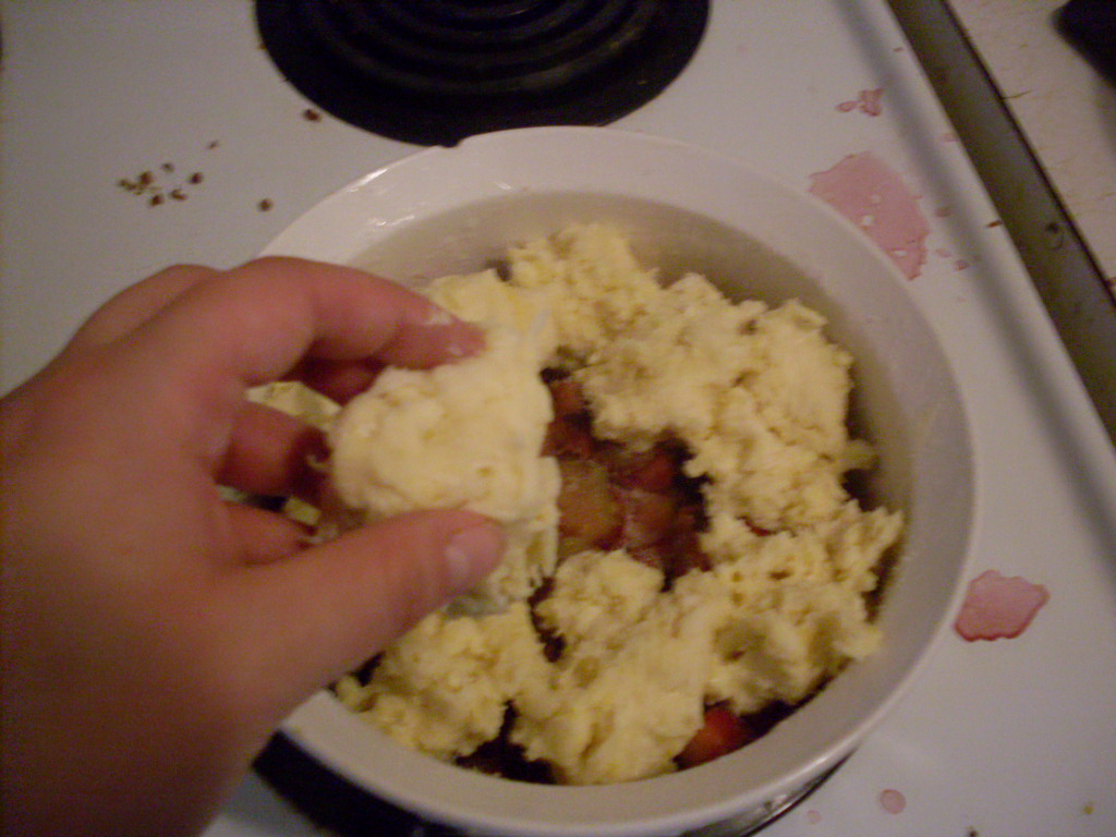 Using a spoon or your fingers, pluck golf-ball-size rounds from the bowl and place on top of rhubarb, one ball at a time, until there is no dough left in the bowl and the rhubarb is mostly covered. You can smooth it down if you want, but I never bother. “Rustic” means that it looks homey and didn’t require fussing.