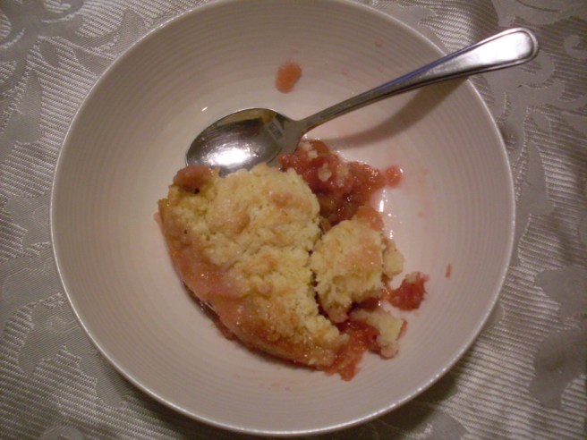 Bake for about 30 minutes, or until the top is golden and the rhubarb mixture bubbles around the sides. Let cool 10 minutes, then serve warm, with ice cream. I forgot the ice cream, and really noticed the lack of it.