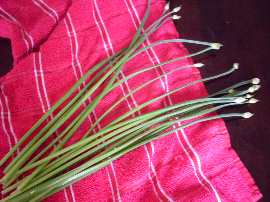 *These may be garlic chives. I have been operating under some confusion forever. Oh well? Garlic scapes should work the same.