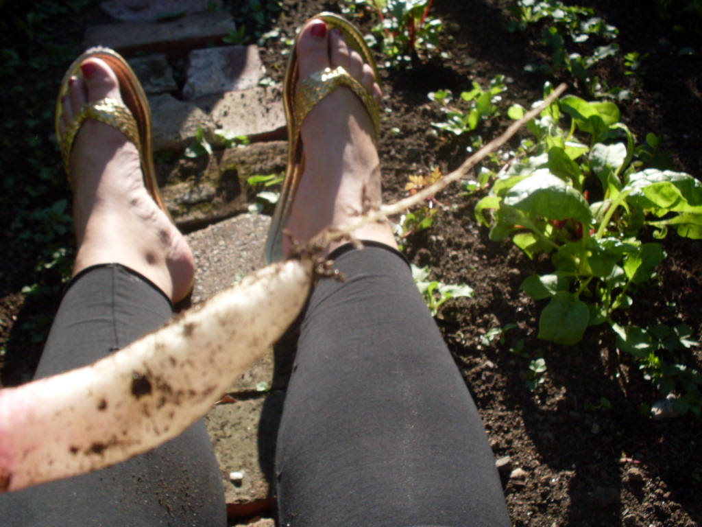 There were seven in total, but we ate the first two fresh out of the ground, cleaned with water from the hose. What peppery, delicious little things! If I wasn’t sold on gardening before, I am now. I like gratification you can eat.
