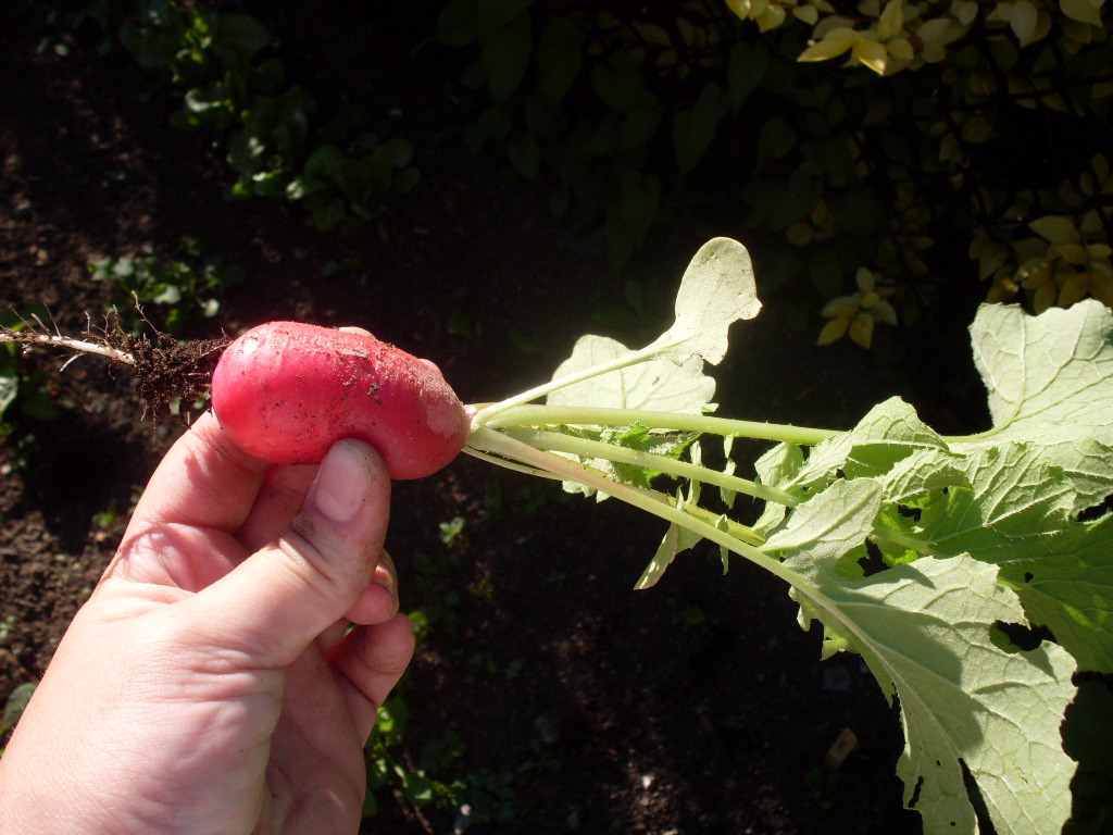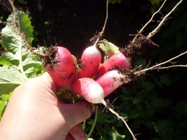 Ordinarily, I would make a grand fuss out of accidentally deleting my last post, and perhaps I will later when it comes time to re-write it. Nothing can tarnish my sparkly mood right now, however. I HARVESTED MY FIRST RADISHES!