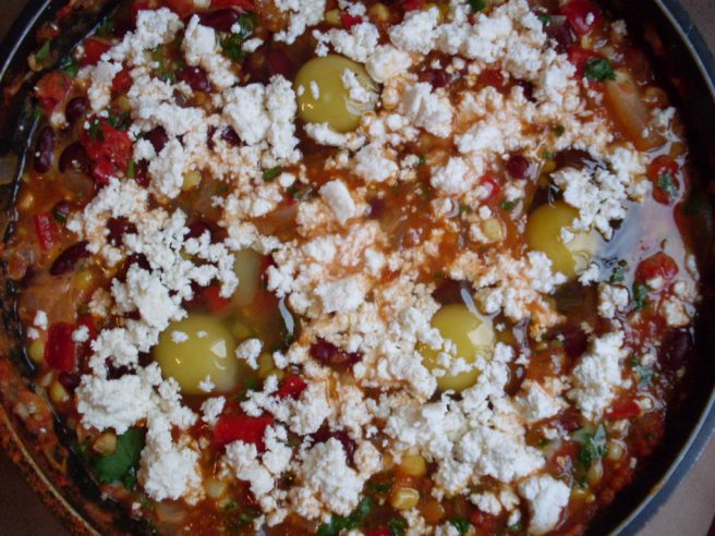 In the spirit of Meatless Monday, we had a fancy sort-of-breakfast for dinner. It’s the fresh and hearty love-child of huevos rancheros and eggs in purgatory, and it’s something you could serve for any meal, whenever. You can make the sauce ahead of time – if you call it a sauce. It’s more like a quick, loose chili, or a Mexican-inspired marinara with corn.