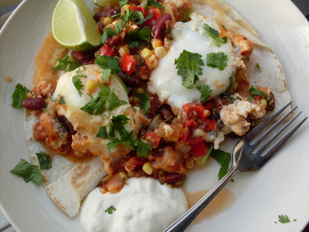 Enjoy! These are cheap, fresh, easy, fast, and really, really tasty. The corn and peppers are sweet, and the tomatoes lend a tart whoosh to things, and the beans make you forget there isn’t meat, in case the cheese wasn’t enough for you. The eggs are good because eggs are always good. And the cilantro makes it taste like Mexican Night without all the trouble and effort you always seem to have to go to on Mexican Night. Try it, and let me know how you like it!