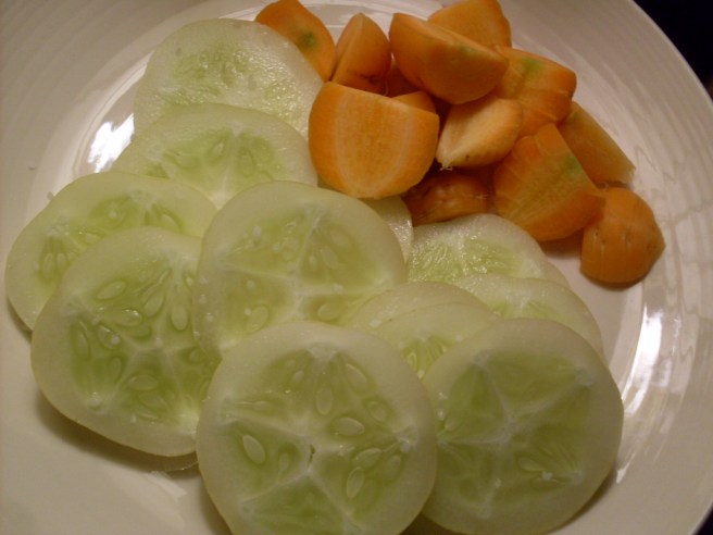The contest and general chaos of our lives has also meant it’s been awhile since we were at the garden. You know what? I think gardening somewhere other than where you live is maybe the best way to do it, because every time you go it’s a surprise. A thrilling one, because every time we go now we’re pulling food out of the ground and taking it home, and today’s delights included carrots, a few beets, and my first two lemon cucumbers, which I am as proud of as if they were spiky little children.