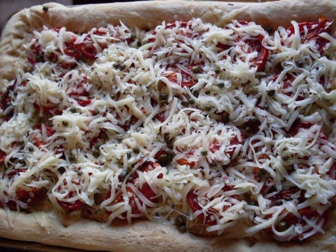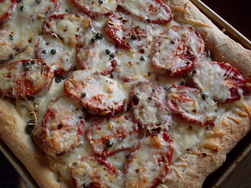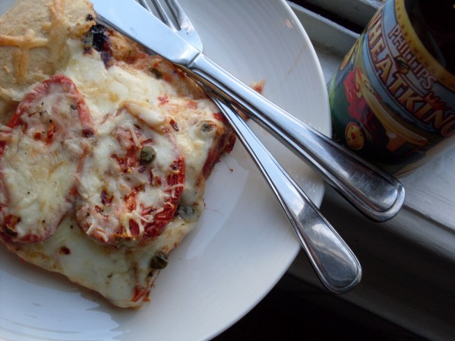 There’s a lot to be said for homemade pizza, whether you dawdle over homemade, buy the dough from your favourite take-away place, or just get frozen dough from the grocery store. The advantage to using dough over a premade crust (other than not having to eat something that pretty much tastes like cardboard and has weird speckles of what you kind of recognize as “cheese” all over the thing) is that you get the smell of baking bread, which is the best thing about pizza, aside from all the cheese. Use whatever cheese you like, but (and this will seem completely out of character) I prefer low-fat mozzarella, because it’s stringier and I like my pizza cheese stringy.