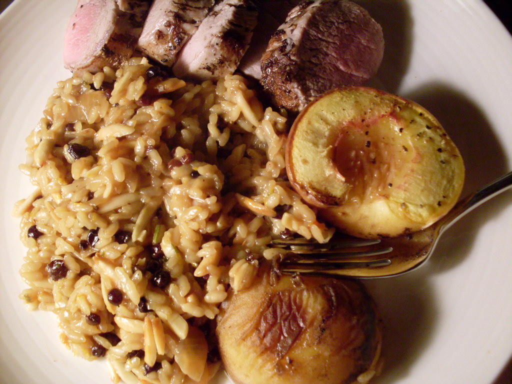 The risotto on offer today is one that qualifies for Meatless Monday, but you’ll notice that it’s Tuesday now and there are perfectly pink medallions of pork tenderloin on the plate. Ignore those if you found this via the Meatless Monday website; the risotto is what’s really important here.