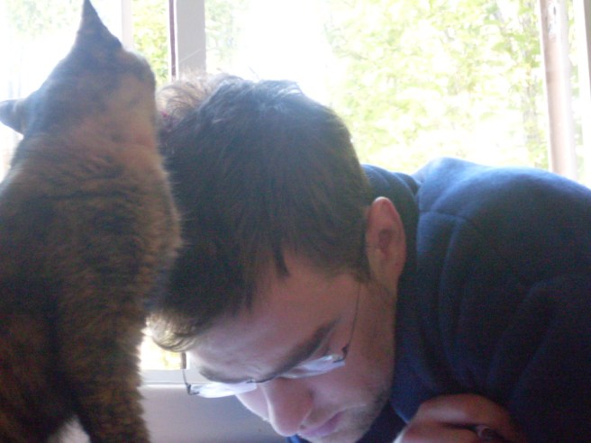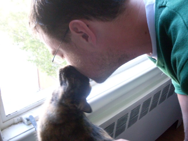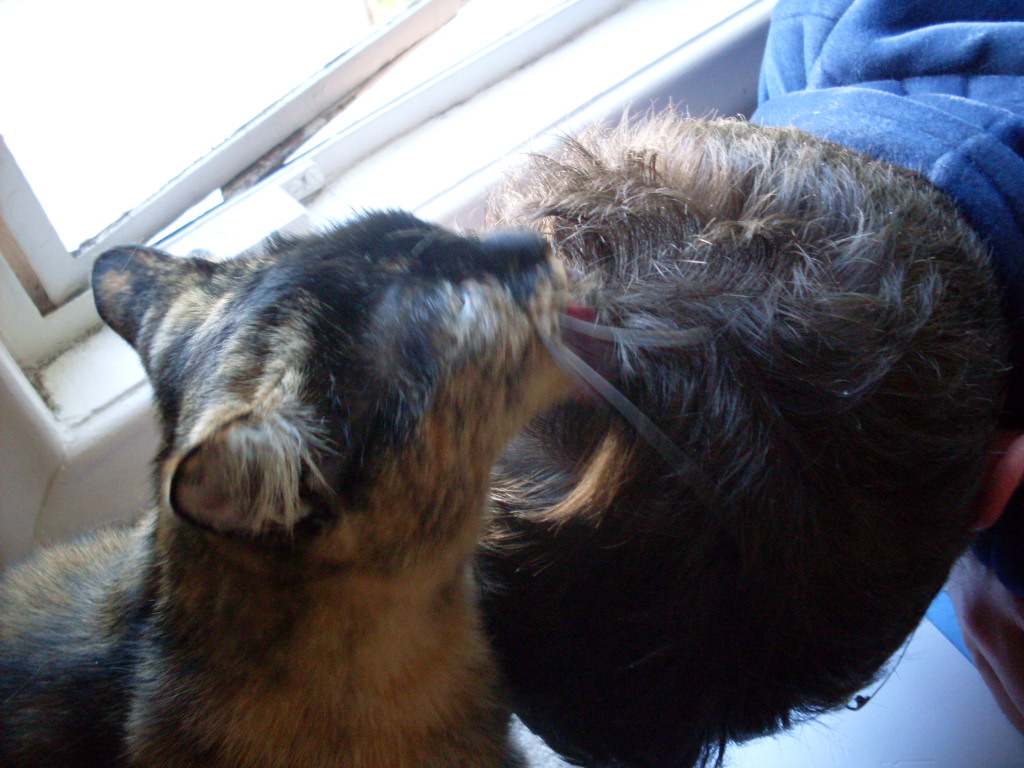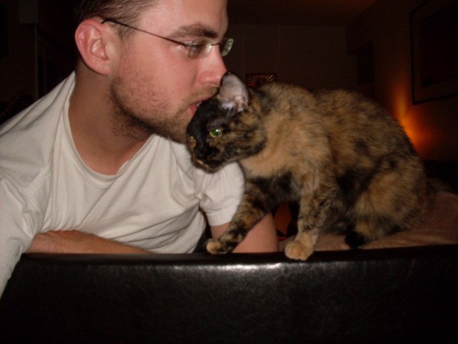 For some reason, the cat bathes Nick rather frequently. She either thinks he’s her kitten, or is absolutely disgusted by him and feels compelled to clean him every chance she gets.