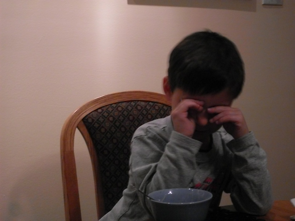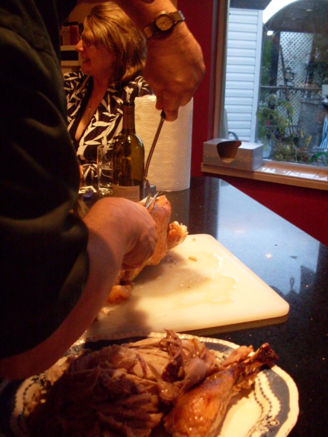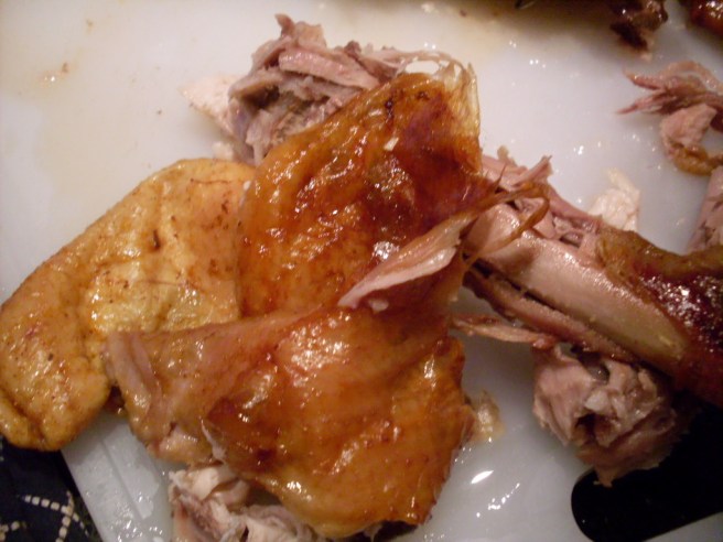 Dad’s getting pretty good about not stabbing me when I reach in to tear pieces of meat while he’s carving the thing. He sets the crackly skin at the edge so I can reach it without putting my hand at the pointy end of the knife.