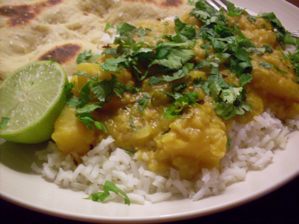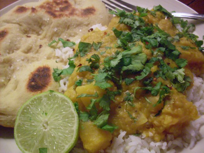 Serve with rice, garnished with sliced lime, cilantro, dried chilies, and yogurt. Sop up the warm, slightly sweet and spicy stew with warm, naan bread, either store-bought or homemade, and if you’re going to make homemade, this recipe is pretty excellent.