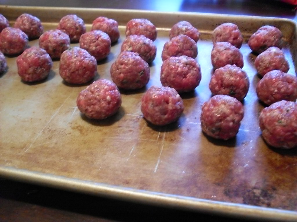 In a large bowl, combine beef, bread crumbs, cheese, garlic, oil, egg, parsley, Worcestershire sauce, pepper, chili flakes, and salt, and squish the whole thing around with your hands, just enough to mix the ingredients and no more. Roll this into balls about one-inch in diameter – you should end up with 28 to 30 balls.