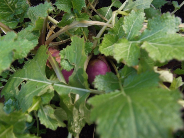 Our little turnips, which we’d given up on, had grown to the size of golf balls, pink and purple and white. We thought we hadn’t planted them deep enough – we hadn’t – and assumed when we last visited that they probably wouldn’t grow. Because we took a whole lot of chard out of there at the same time, we elected to leave them in place on the off chance that they’d survive a little longer – I planned to go back for them and harvest the greens.