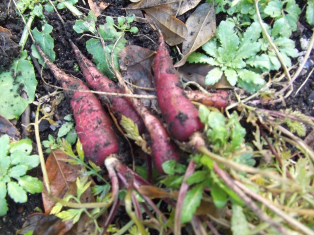 A few carrots survived the cold and the snow and the rain and the rot – I pulled them out from beside the kholrabi, which didn’t make it.