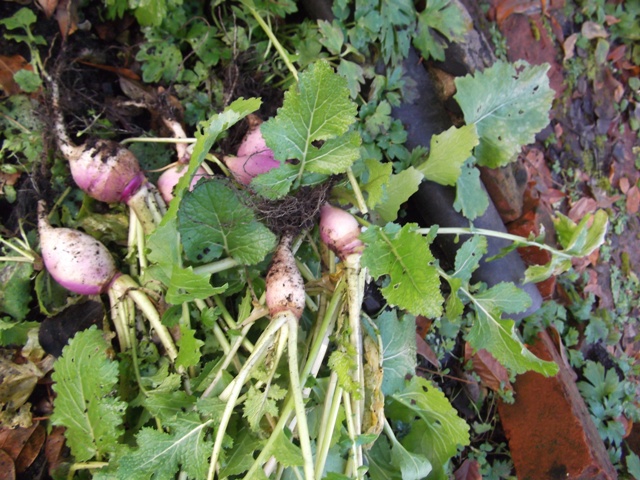 We’ve neglected our garden over the past couple of months, as snow fell in November and it rains a lot here and it’s dark when we get home from work so there’s never an opportune time to check in with it and see how things are going, and if anything there is still growing. We planted some turnips and kholrabi just as summer was ending, which according to the seed packets ought to have been ready for harvest three months ago, but our chances to go back were few and far between.