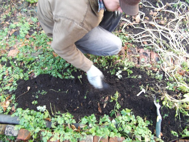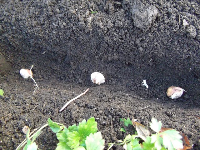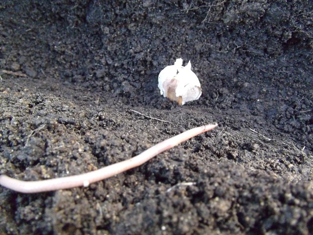 Then we planted a row of individual cloves of the stuff. A worm showed up to say hello.