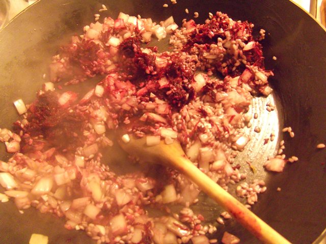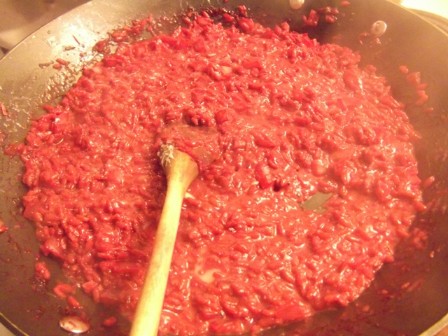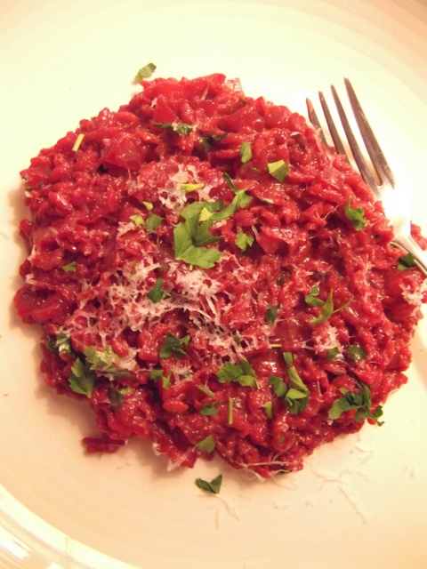 Beet risotto — how fascinating! I love beets, I love risotto, I love having red alien fingers… what’s not to like?