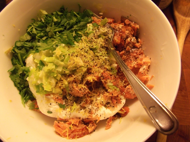 In a medium bowl, mush together yogurt cheese, smoked salmon, and lemon zest and juice. Use a fork – the best mushing is usually done with a fork. Pour buttery garlicky leeks into the bowl, and add parsley, salt, and pepper, stir, and taste. Adjust seasonings as needed. When you like what you’re tasting, stir in the egg. Set aside.