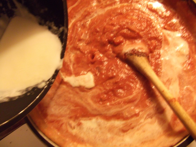 Bring light cream to just a simmer. Remove from heat. Meanwhile, heat olive oil in a pot over medium-high heat. Add onions and garlic, and cook until translucent. Add crushed tomatoes. Once the tomatoes begin to burble and steam, reduce heat to medium and carefully stir in cream, slowly and in a steady stream, stirring until fully incorporated. Remove from heat.
