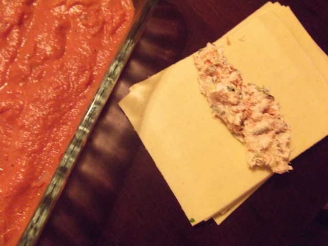 Ready pasta for rolling according to package instructions. For store-bought fresh pasta, you may need to soak it for a couple of minutes in cold water. Trim to about 4″x3″.