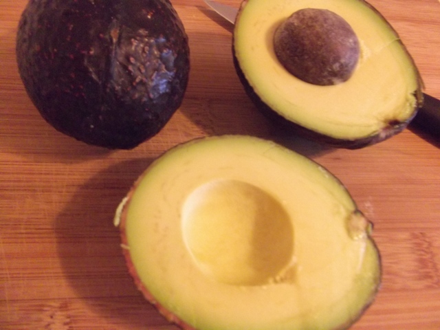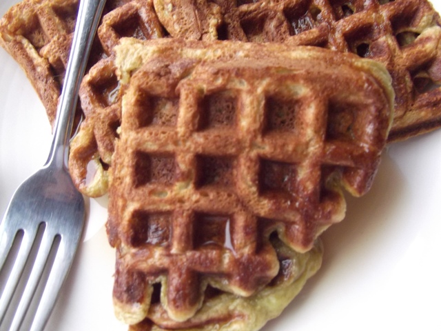 The weekends offer a bit of relief, because he can eat at any point within about a 90-minute period and no one has to leave for work at 8:00 a.m. A weekend breakfast must make up for the previous five days’ worth of hot glop. Since I’m the one making breakfast, that means waffles, which everyone knows are the greatest of all the breakfast foods. These ones have avocado in them – the taste of avocado in the finished product is very light, with a buttery sweetness, and goes magnificently with maple syrup.
