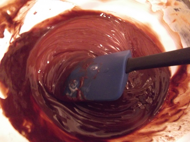 Using a double boiler, a glass bowl over just-simmering water, or a microwave (three rounds of 30 seconds, stirring each time), gently melt chocolate chips and butter, stirring occasionally until smooth.