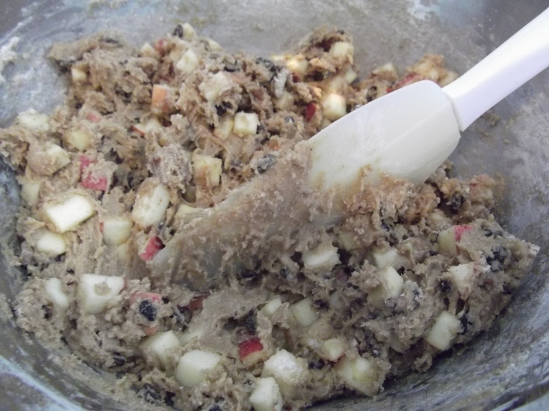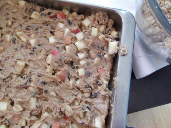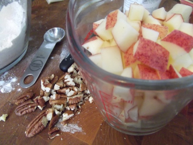And then I pulled my well-worn copy of Fannie Farmer off the bookshelf to check one little thing, and the book flipped open to a spot I use quite a bit, to a recipe for an apple cake with raisins and walnuts, one so close to what I was doing that I am certain I didn’t invent it after all. I make the sour cream spice cake on page 344 quite often, and there was the apple cake, just the other side of the page on 343 where it’s been all this time, where I must have seen it a million times but never thought about it.