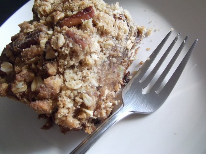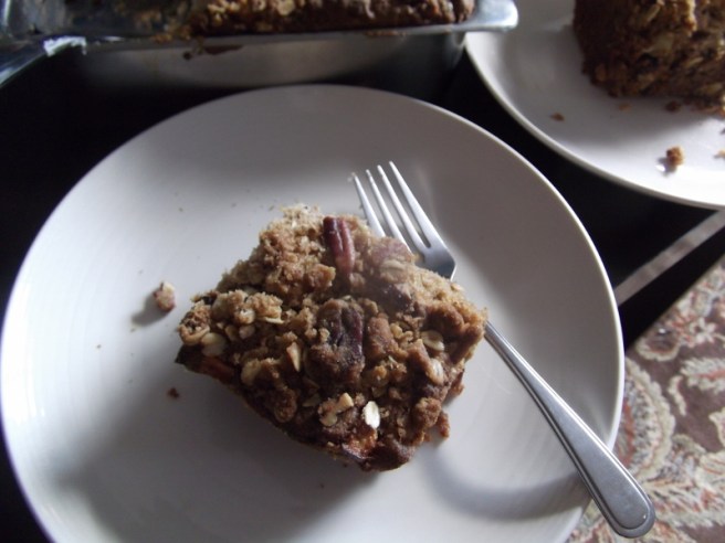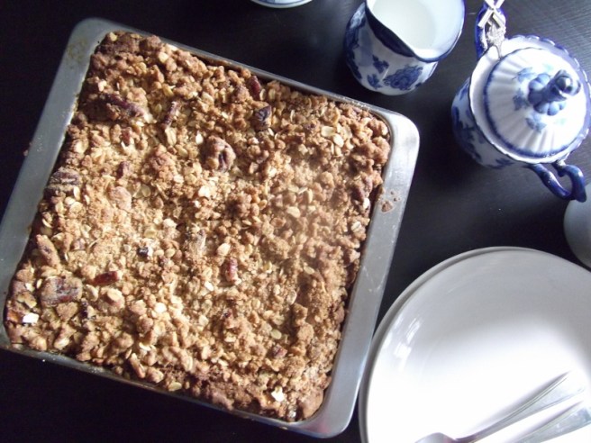Pour into the prepared baking dish. Sprinkle oat mixture over top of the batter, and then bake for 40 to 45 minutes, or until a toothpick inserted into the centre of the cake comes out clean. Serve warm, with tea or coffee. You can say you invented it, if you like.