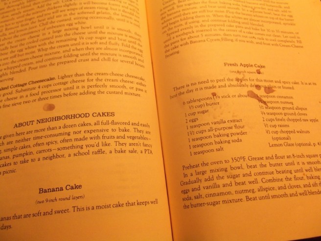 Anyway, here’s a recipe for apple cake. It’s kind of like this other apple cake I know. If you’ve got the Fannie Farmer Baking Book, it’s on page 343.