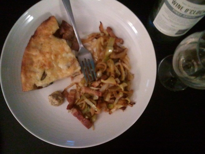 It’s Friday, and I probably could have gotten away with just calling in for sushi, but I wanted something homemade, something made out of stuff I have in the cupboards and fridge. So here’s a dish I’ve made a million times, one that won over Nick in the very beginning when he was just a fetus of a husband, back when we were young and never watched TV because we had too many roommates hogging the remote and no cable anyway. It’s something I made here a few years ago, but that has evolved and grown into a better dish – why did I never think to add cheese before?! Anyway, here’s Toad in the Hole: Version 2012. It’s an eggy, pancakey thing – basically Yorkshire pudding with stuff baked in – and it’s good with salad, but it’s better if you serve it with onions and cabbage fried with bacon. Because what isn’t?