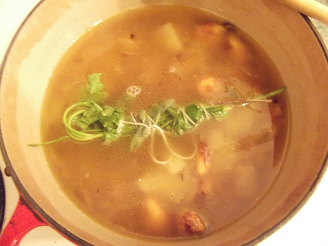 Remove bundled herbs and discard. Puree soup using a blender or immersion blender. Taste, adding salt and pepper and adjusting seasonings as needed. Serve immediately, or simmer for an additional five to 1o minutes, or until desired consistency is achieved. Remove from heat and finish with cream, if desired.