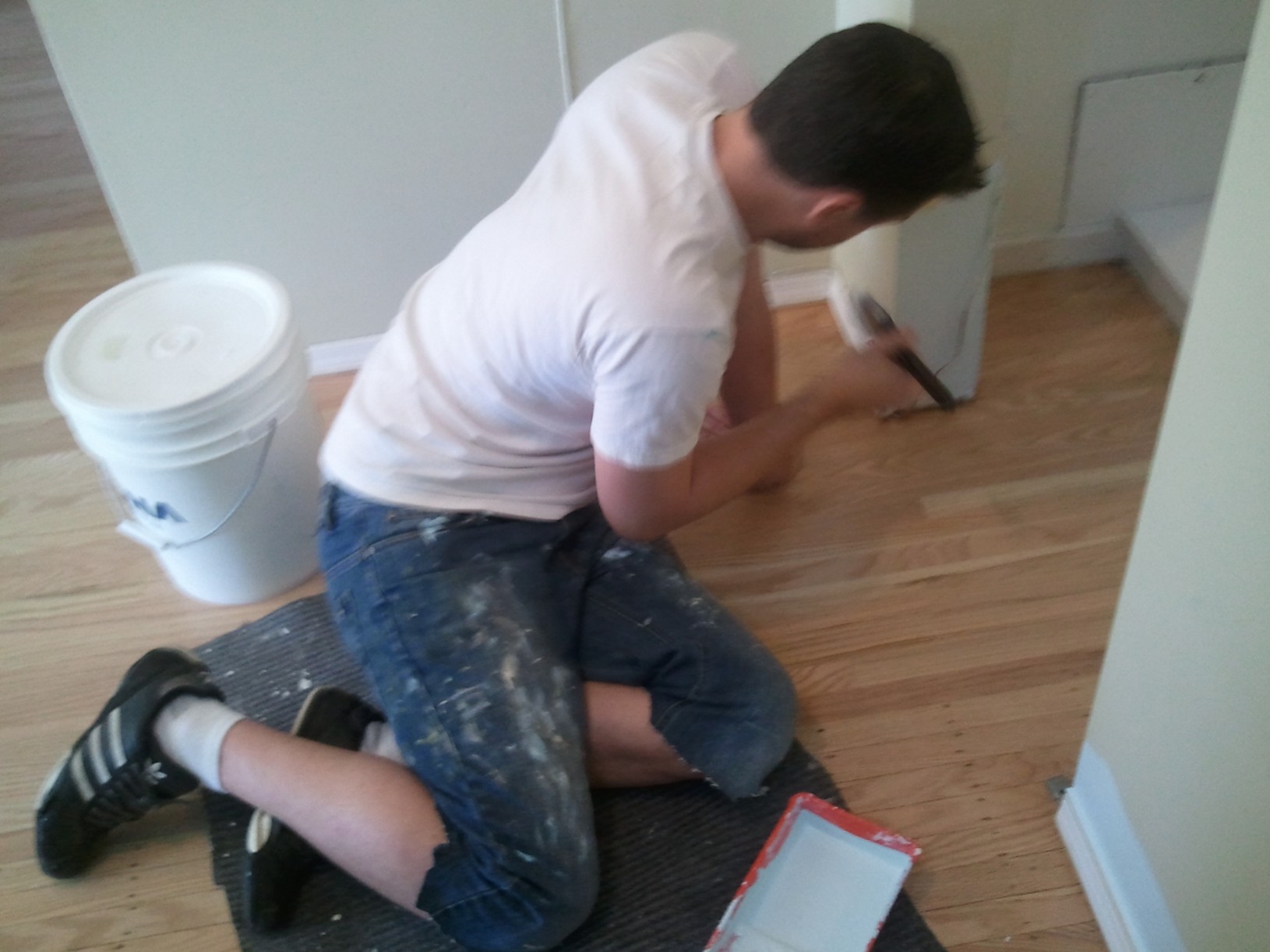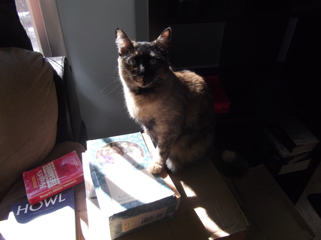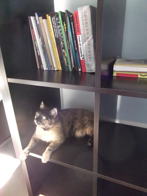 We have more windows and better light, and we’ll have lots of time to enjoy these things as the rent on the place will prohibit us from spending much on anything else. Cat has not settled down since we finished moving in last week because there are so many new rooms and cupboards and hallways to explore, and I hear her little voice from all the corners of the apartment reminding me she’s still here. She checks in once in awhile, but she still has a lot to do. There’s an upstairs to this place, and she has to rub her face on every inch of every step and that takes more energy than a five-pound furball can muster all at once.