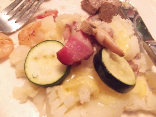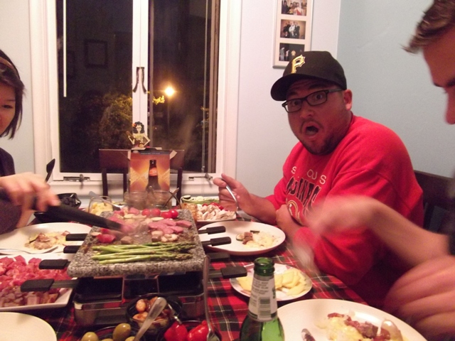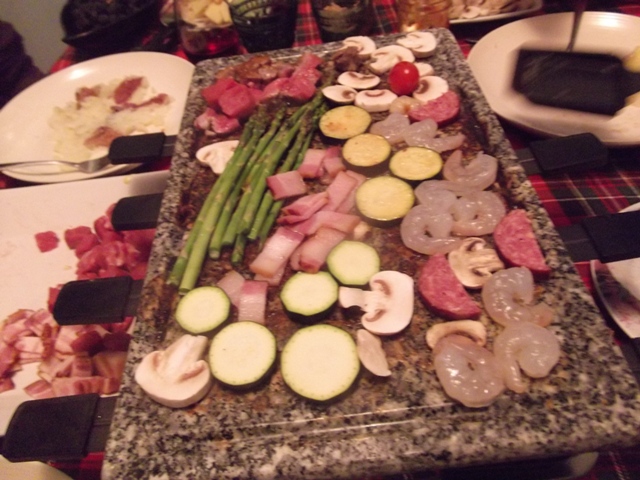 To make a proper raclette meal, you boil more quartered red or white potatoes than you think you’ll need, and slice quite a lot of cheese. I boiled a pound of potatoes per person. There were five of us, so I sliced two pounds of cheese. We had asparagus, mushrooms, zucchini, and grape tomatoes for our veggies, and cubed steak, chopped bacon, shrimp, and rounds of Farmer’s Sausage for our protein. Start with the bacon to lube up the grill a bit before cooking the other things. If you’re a vegetarian, wipe the top down with a bit of olive oil before starting.